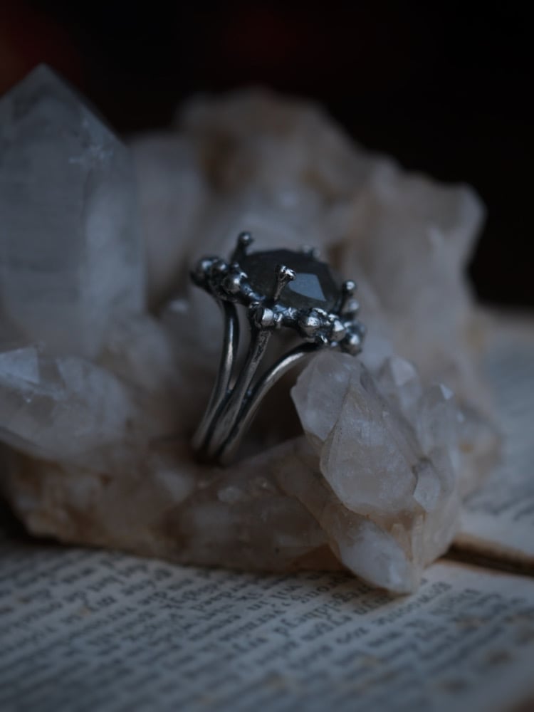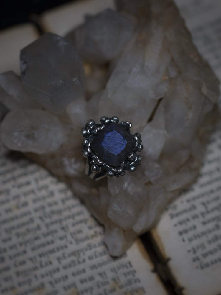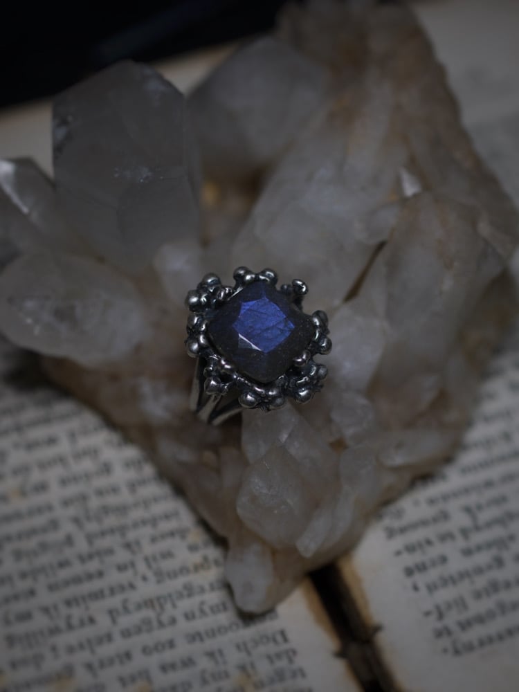 Fourteen life size bat bones form a ring. With blue-purple labradorite stone, set with four life size bat bones. This ring is handmade in solid sterling silver. Finished in antique finish. Statement piece. The ring is made to size, this ring can be made in max size US 9/UK S/EU 60. The ring in the photos is an example of the finished product, stone is not set in the photos: first photo is photoshopped to showcase how it will look like set. The ring will be handmade from scratch so end results may slightly vary.
