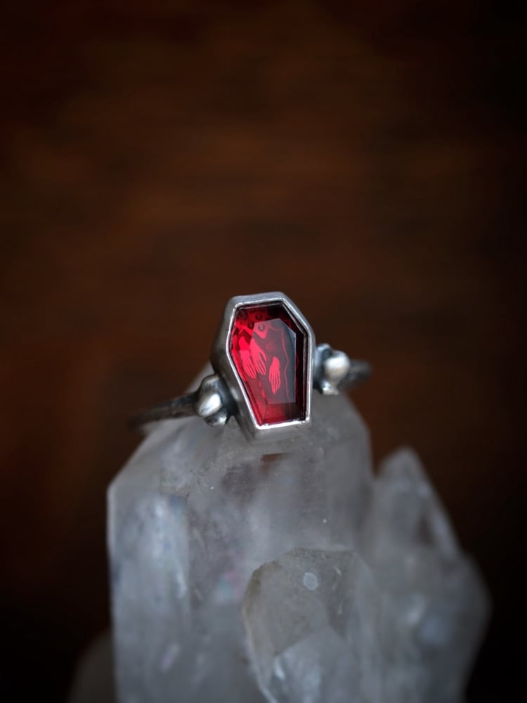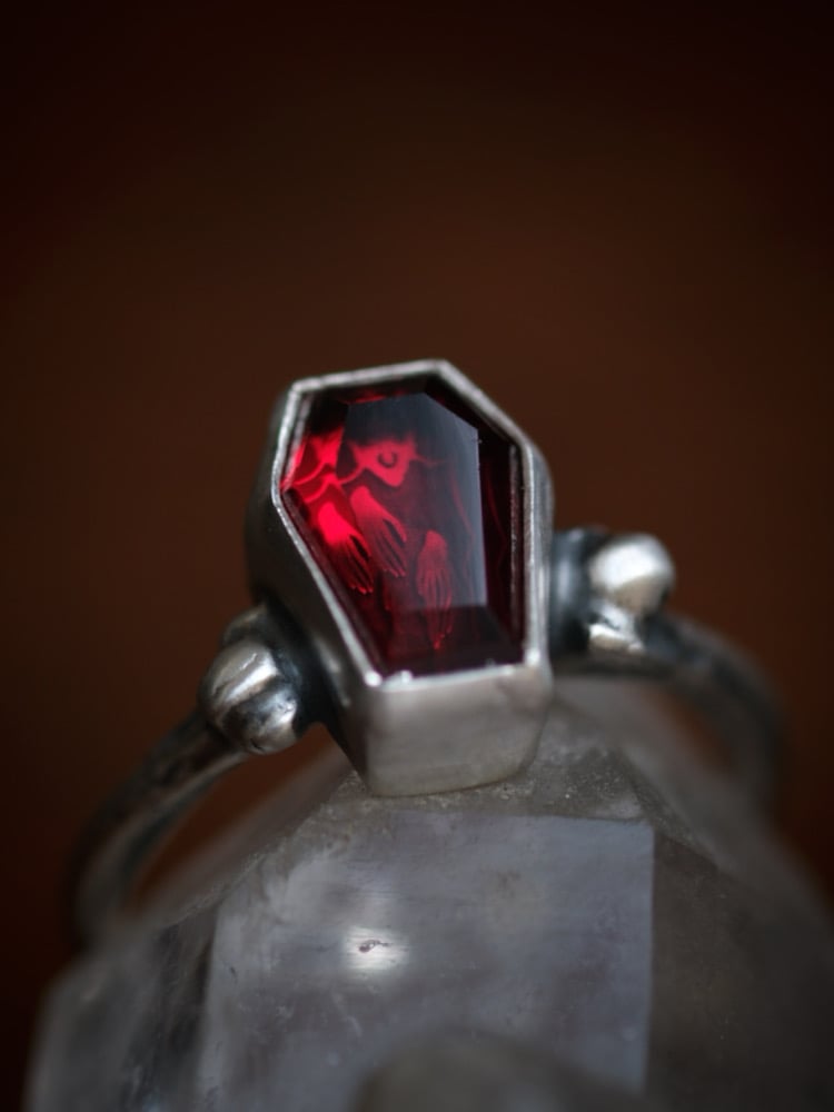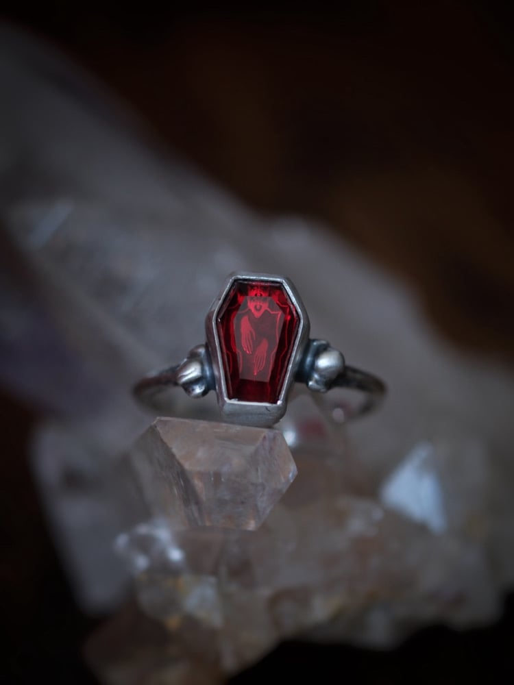 Two life size bat bones hold a lab made red quartz coffin gemstone with my laser engraved Nosferatu underneath.